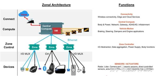 未来的汽车E/E架构公认将是中央计算架构,或者叫Zonal架构。即所有的应用均由中央计算平台完成,中央计算平台就像一个服务器。