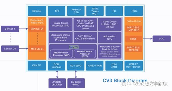 除了高通、英伟达外还有三星,三星的AUTO V9已成功进入大众供应链,大众/奥迪/保时捷的座舱系统MIB3都是三星芯片。三星本来还有一条A系列产品线,针对智能驾驶,但似乎采用的客户较少,三星目前主推的是Exynos Auto V920,也是三星第一个车载4纳米工艺芯片,应该是包含了智能驾驶和座舱的功能。Exynos Auto V920的公开信息几乎没有,不过利用手机平台分摊研发成本是三星和高通的法宝,三星目前4纳米工艺芯片主要是Exynos 2200,V920应该是Exynos 2200的魔改版。考虑到车载可以用风冷甚至水冷,V920的CPU配置可能是4个Cortex-X2加4个Cortex-A710,GPU则是AMD的RDNA2架构的Xclipse,算力估计有2.1TFLOPs。AI算力据说是Exynos 2100的两倍,那就是52TOPS,也不算低了。英伟达、三星和高通都非常熟悉座舱领域,对于那些不太熟悉座舱领域的就需要考虑覆盖自动泊车、电子倒车镜和DMS这些功能。这就是安霸的CV3。安霸CV3内部框架图\