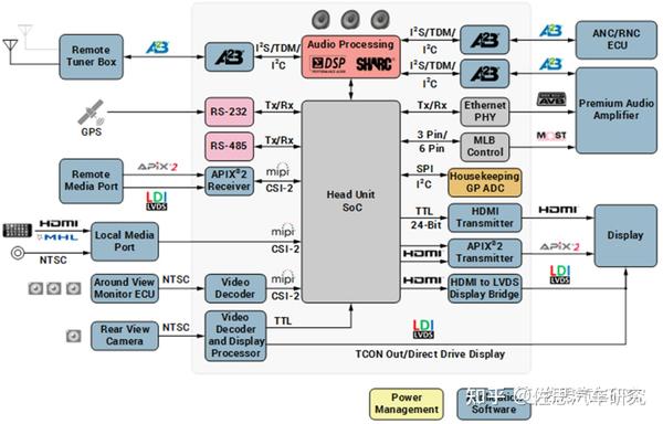 对于座舱域控制器芯片来说,主要就是考虑更多的视频输出以及更强大的音频功能。有强大的GPU,更多的视频输出易如反掌,SA8795可以支持多达16个显示屏。不过标准版Orin只有一个DP视频输出,还是通过Type-C的,显然未考虑座舱应用,不过针对座舱的Orin版本应该有较多的视频输出。当然,更多更高速率的以太网接口也很必要。音频是智能座舱的核心功能,涵盖车载音响、语音识别、e-Call、消噪及回声消除、主动车内降噪,主动路面降噪、DSP音效等应用。随着汽车智能网联化的发展,对音频的开发要求也越来越高,需要加入更先进、功能丰富的信息娱乐功能以满足消费者的用户体验。但传统的模拟并行音频信号传输方式,难以在功能增加与整车轻量化(线缆的重量及成本减少)之间取得均衡。ADI(Analog Devices Inc.)通过对音频总线的优化,推出A2B(Automotive Audio Bus)车载音频总线,能够提供比传统模拟音频总线更出色的音频质量,同时还能大大节省汽车音频线束重量和成本(约减少75%)。要想做好汽车座舱音频,就要用A2B音频总线把音频部分独立出来。座舱系统典型音频应用\