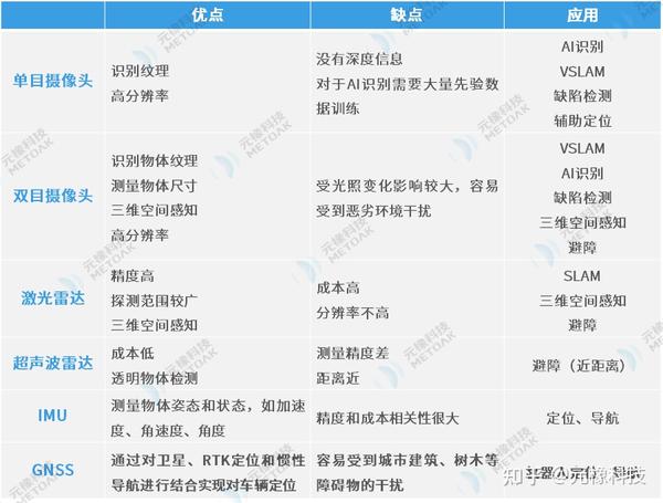 一般来说,机器人会有三个核心的技术:感知、决策、控制执行。而我们专注的双目立体视觉其实就是感知层面的一种技术方案。正如我们所知,人类身上的“传感器”是我们的眼睛、耳朵、鼻子等,不同的传感器起到不同的作用,最终我们可以根据感知去决策并控制我们的运动。机器人也是一样的,对于可移动机器人来说,最核心的技术点在于建图和定位,就是一要知道周边有什么环境,二要知道自己在什么位置;对于工业制造类机器人来说,侧重点可能不一样,它要去识别、定位、检测、测量等等。目前我们已经有很多类型的传感器,而在具体领域的应用上,我们就要去对比每一种传感器的优缺点,从而找到最适合的方案。环境感知技术对比首先单目摄像头是一个非常广泛使用并且成本较低的方案,它的优点是便宜成熟,分辨率可以做的很高,但是对于机器人而言,单目摄像头只有X、Y方向的信息,缺少距离感知。双目摄像头相当于两个单目叠加,它除了具备单目的优势和特点之外,还能通过一系列运算得到周围物体的深度信息和尺寸信息,因此可以更好地应用于移动机器人的定位、避障等场景。激光雷达也是在机器人或者车载领域用的很多的一种传感器,它的测量是基于光的飞行时间。激光雷达的优点是光的距离可以达到很远,就是如果场景很大,要做测距也能测的很准。而它的缺点就在于成本高昂,如果要去感知一个非常精密的3D场景,那就需要用到多线激光雷达,成本会很高。还有一种我们经常用到的传感器是超声波雷达,汽车倒车雷达就是它的一个典型应用场景,机器人里面也会用来做一些避障。超声波雷达是感知层面多传感器融合的技术方案里面必不可少的一个低成本感知方式。它可以解决视觉和激光雷达面临的一些问题,比如透明玻璃或者说一些反光的物体,超声波雷达在应对这些问题上是一个很好的补充。另外一些传感器,比如IMU是用来做自身姿态的检测的,包括加速度、角速度以及方位等。还有全球导航定位系统可以提供精确的具体位置,在室外机器人上应用比较多,但问题是容易受到一些遮挡物的干扰,导致定位精度下降很快。