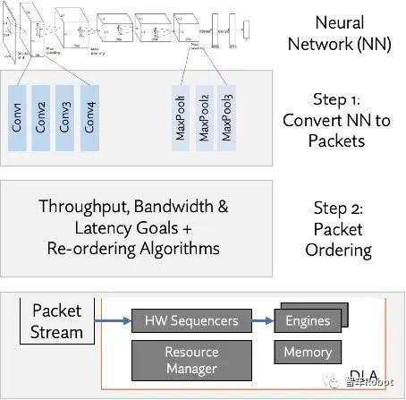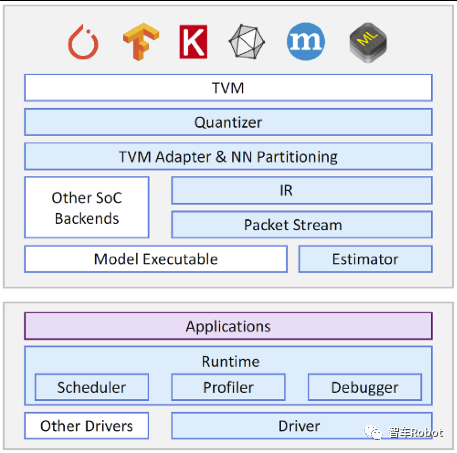 图3.神经网络数据包流到NPU执行单元如图4所示,一个在异构SoC中进行NN协调的全栈解决方案。深度学习框架的支持来自于Apache TVM。编译可以针对多个SoC配置。自定义层支持和多任务API有助于支持并发的NN模型,同时使解决方案能够适应未来的工作负载变化。高级功能包括混合精度量化功能以及用于调试和分析的工具。