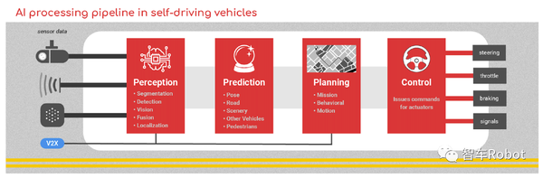 图1.自动驾驶汽车中的人工智能处理感知是最多样化的阶段,它获取有关环境和车辆在其中的姿态的知识:•分割是为了对感兴趣的像素进行分类。•检测将标记的像素群构建到需要识别和跟踪的对象中。•视觉能解释诸如车道线、路面、标志牌、车辆和行人等物体。•融合将来自不同传感器的信息以不同的速度混合成一个比单一传感器所能提供的更强大的集合。例如生成图像的相机、检测附近物体的雷达,以及构建3D点云的激光雷达。为了改善对不同场景和环境条件的处理能力。•定位将车辆放在地图上。预测,可能是最关键和最密集的阶段。它与规划阶段一起,是解决L5自动驾驶的关键。简而言之,预测必须确定场景中车辆、周围车辆和其他物体的动作风险。几乎没有时间去辨别附近司机的意图或风格(“激进”与“平静”)。规划有两部分:全局和局部。V2X(车联网)信息可能会增强此阶段的数据。•全局规划根据“任务”找到最佳路线。有些挑战是是众所周知的。在大型网络中,简单地预先计算所有可能的路线是不切实际的。即使使用IMU(惯性测量单元)增强功能,GPS也无法提供城市驾驶所需的精度。作业区、恶劣天气和演习等正常/异常问题可能会扰乱计划。一个例子是无法安全地改变车道时,错过了高速公路的出口。•局部规划在优化全局规划的同时找到了避免障碍的轨迹。行为计划包括道路规则、活锁(指线程虽然没有被阻塞,但是由于某种条件不满足,一直尝试重试,却终是失败)或死锁(指多个历程在运行的过程中因争夺资本而造成的一种僵局。当历程处于这种僵持状况时,若无外力浸染,它们都将无法再向前推进)的情况,以及优先观察者(将按照车辆当前位置有关的规则检查是否允许其前进)和间隙观察者(将检查“碰撞时间TTC”以确保其他交通参与者的安全通行)。运动计划将连续空间转化为离散空间并理解时空关系,如惯性和滑移的影响。控制将规划输出转化为物理执行器的命令。这些包括转向、油门、制动和信号。可以应用经典或预测控制算法。与其他阶段相比,控制阶段对AI处理的需求有限,但在计算上可能仍然很复杂。在通往L4和L5的道路上,尚未发现的细节可能会显著增加对系统要求。人们相信,通过更多处理,是可以达到L4的。通过更强大的算法集和更多的处理能力,人们对达到L5表示乐观。一些问题已经被探索出来,还有许多其他问题仍在继续。研究人员现在正瞄准自动驾驶堆栈的架构,寻找改进的方案。管道中的计算密集型AI任务的例子包括:•感知:对高分辨率场景中的每个像素进行语义分割;候选区域检测、3D点云检测和融合;重粒子滤波;SLAM闭环。•预测:道路、风景、车辆和行人路段所需的不同方案;隐马尔可夫模型(从一组观察到的变量中预测一连串的未知变量);人类显着性模型;注意力集中;世界观认知模型的建立和更新。•规划:运动的曲线插值;顺序优化;胁迫下短窗口的实时确定性。