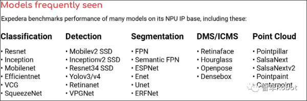 图2常用的神经网络模型基准随着整个处理组合的变化,将硬件锁定在针对有限的、特定模型优化的AI推理解决方案是不明智的。任何不能调整的解决方案,以跟上改进后的网络,它都会落后。计算架构应该如何应对,在保持灵活性的同时提供所需的AI推理性能水平?将自动驾驶堆栈的进展转化为SoC架构存在很多显而易见的风险,超过L3的自动驾驶工作负载将是多种多样的,对优化极具挑战,甚至在项目早期难以定义。随着最先进的自动驾驶堆栈的进步,将会出现更好的架构组合。在最初的自动驾驶设计浪潮中,AI推理以可编程GPU的形式推出了软件解决方案。其结果是灵活性高,但空间、冷却、电源要求很高,神经网络(NN)资源利用率较低。重量和功耗都会缩短电动汽车的续航里程。当未来需要更多操作并降低功耗时,GPU作为可扩展的AI推理解决方案就已经过时了。在第二波浪潮中,钟摆转向了硬件。自动驾驶工作负载最适合的是安排在SoC中的异构内核。尽管不适合大多数AI任务,但CPU内核在组织、调度和融合AI操作方面发挥着至关重要的作用。GPU内核擅长用于视频解码、缩放和图像处理的传感器接口。加密和额外的关键加速可能落在DSP内核上。一批商业SoC如雨后春笋般涌现,大多数都是围绕明确定义的L3问题集设计的,有些则以L4为目标。供应商包括英特尔(通过Mobileye)、英伟达、高通和其他公司。神经网络(NN)必须在所有条件下提供分辨率、准确性和确定性,如果要保持不确定性和一定范围内的误差,就没有可接受的折衷方案了。即使是使用经典NPU硬件的SoC设计也会遇到几个问题:•扩展AI推理硬件的规模往往会增加延迟并降低确定性。•AI推理硬件利用率较低(通常约为30-40%)会增加面积和功耗。•同时容纳许多不同的神经网络(NN)会导致调度和内存问题。•根据SoC架构的选择,将TOPS划分为合适大小的单元,以满足工作负荷的需要,这可能很复杂,或者不可能。