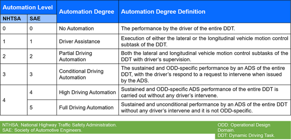 图1 自动驾驶自动驾驶定义自动驾驶汽车(Autonomous Vehicle),是指一种通过传感器和运算单元实现无人驾驶的智能汽车,其核心硬件模块包括电子控制单元(ECU, Electronic Control Unit)/域控制器(DCU, Driving Control Unit)和传感器(感知元件)两大部分。根据美国汽车工程师协会(SAE)发布的SAEJ3026标准和2021年8月中国出台的《汽车驾驶自动化分级》国家标准,自动驾驶被分为L0至L5 六个等级,从L0级应急辅助驾驶到L5级完全自动驾驶,如下图所示: