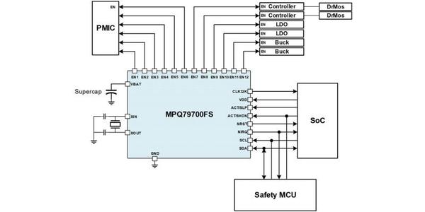 图5 MPQ79500MPQ79700是一款 12 通道功能安全电源定序器,提供可配置性与灵活性,能够支持不同应用与片上系统 (SoC) 的跨代设计复用,集成内置自检 (BIST) 等安全机制,以实现高诊断覆盖率,使系统达到目标 ASIL 等级。
