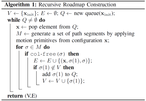 通过生成覆盖(自由)构型空间的离散样本集,并通过使用精确的转向程序获得的可行路径段将它们连接起来,可以实现类似于从初始构型出发、递归地应用栅格生成运动基元的所产生的效果。