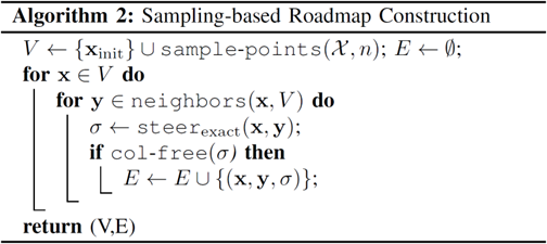 大多数基于采样的路线图的构造方法都遵循算法2所示的方案,但是在采样点函数 text { sample-points }(mathcal{X}, n) 和邻点函数 text { neighbors }(mathrm{x}, V) 的实现上有所不同。采样点函数text { sample-points }(mathcal{X}, n)表示从构型空间 chi 中选择 n 个点的策略,而邻点函数text { neighbors }(mathrm{x}, V)表示为顶点 x 选择一组邻顶点 N subseteq V 的策略。对于邻顶点 y,该算法将尝试通过精确转向函数 text { steer }_{text {exact }}(mathrm{x}, mathrm{y}) 来找到一条从 y 连接到 x 的路径段。