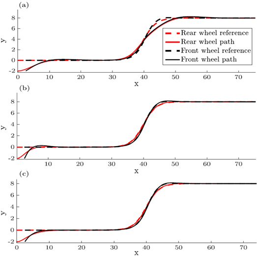 (a) 当曲率非零时,纯追踪控制策略偏离参考路径。(b) 基于后轮输出的控制器将后轮驱动至后轮参考路径。系统的二阶响应导致了过冲。(c) 基于前轮输出的控制器以一阶响应将前轮驱动至参考路径并跟踪路径。