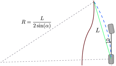 一个圆(蓝色)位于后轮位置和参考路径(棕色)之间,使得弦长(绿色)为前瞻距离 L ,并且该圆与当前车辆的朝向方向相切。纯追踪的控制律的基本思想是,利用半圆弧来拟合从车辆当前构型到参考路径上特定一点,这个特定点在车辆前方、距离为 L ,称为前瞻距离(lookahead distance)。