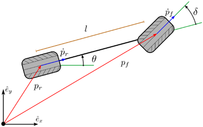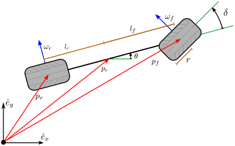 参考图3.1,向量 p_r 和 p_f 分别表示静止坐标系或惯性坐标系中后轮和前轮的位置,坐标系由三个基向量 left(hat{e}_x, hat{e}_y, hat{e}_zright) 所决定。航向 theta 是描述车辆朝向的角度,定义为向量 hat{e}_x 和 p_f-p_r 的夹角。一个坐标系下的微分约束的表达式包括该坐标系下的角度 theta 以及车辆上一点的运动,如向量 p_r(参考[54])或 p_f(参考[55])。