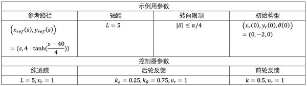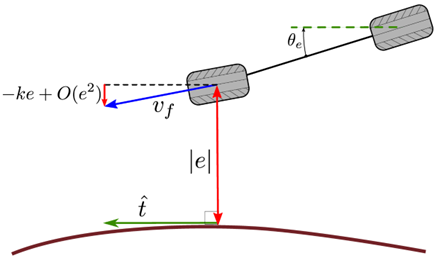 在这种情况下,术语 theta_e 不被解释为航向误差,因为即使在完美跟踪的情况下,它也将是非零的。更恰当的解释应该是, theta_e 是为用于追踪参考路径的标准转向角的前馈项和航向误差项的组合。这种控制律的缺点是,当 left|frac{k e}{v_f}right|>1 时,它未被定义。