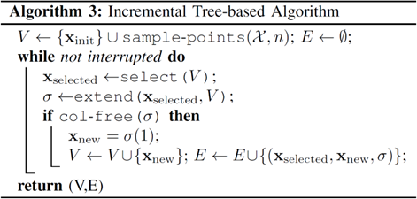 增量路径规划的一类重要方法的思路是,在车辆初始构型处向外增量生长树,以探索可到达的构型空间。“探索性”行为迭代地选择树的一个随机顶点,并在树中应用转向函数,以扩展(expand)所选顶点。一旦树生长到足以到达目标区域,则可以从目标区域内的顶点出发,反向跟踪能到达初始构型的边,来获得生成的路径。算法3中描述了基于增量树的算法的一般方案。