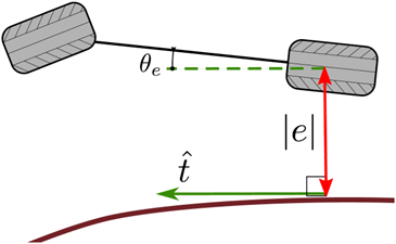 图5.3:基于后轮的反馈控制的反馈变量theta_e 是路径上距离后轮最近的点处的切线与汽车航向之间的差值。标量 e 的大小(绝对值)用红色表示。