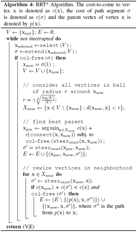 此外,Karaman和Frazzoli证明了RRT以概率1收敛到次优解,并设计了RRT的渐近最优版本,称为RRT*算法[127]。如算法4所示,在每次迭代时,RRT*考虑位于新添加的顶点 x_{n e w} 的邻域内的一组顶点,随后(a)将 x_{n e w} 连接到邻域中的一个顶点,以最小化从 mathrm{x}_{text {init }} 到 x_{n e w} 的路径成本,(b)如果将该邻域内的某个顶点重新连接到 x_{n e w} 后,从 mathrm{x}_{text {init }}到该顶点的路径成本降低了,那么执行这个重连接(rewire)操作。该算法的一个重要特征是,邻域被定义为以 x_{n e w} 为中心的球,其半径是树的大小的函数: r=gamma sqrt[d]{(log n) / n} ,其中 n 是树的顶点的数量, d 是构型空间的维度, gamma 是依赖于实例的常数。结果表明,对于这样的函数,球内顶点的期望个数是树的大小的对数,这对于确保算法几乎肯定地收敛到最优路径、同时保持与次优RRT相同的渐近复杂性来说是必要的。
