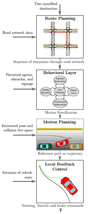根据目的地,路线规划器通过道路网络生成一条路线。行为层对环境进行推理,并生成沿着所选路线前进的运动规范。运动规划器随后求解实现规范的可行运动。反馈控制对致动变量进行调参,以修正执行参考路径时的误差。