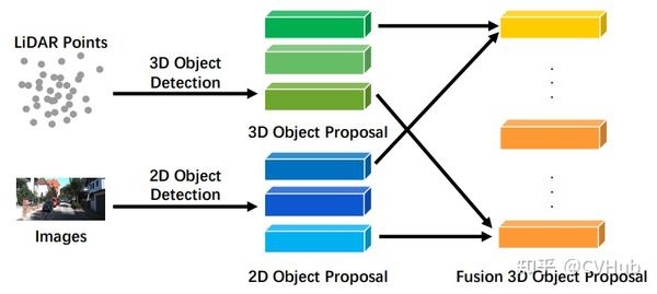 这种融合方法是合理的,因为使用卷积神经网络在相机数据上的表现非常出色,它能在点云中过滤语义上无用的点,并在锥体视角下提升3D LiDAR主干的性能,如[9]。它提取原始点云中的锥体,并配合相应的像素RGB信息输出3D边界框的参数。然而,一些工作另辟蹊径,使用LiDAR主干来指导多视图风格的2D主干,并获得更高的精度。virtual multi-view synthesis专注于基于3D检测提议提取的多视图图像的行人检测,进一步使用CNN来细化先前的提议。[23]和MLOD使用其他分支中的ROI特征来细化仅由LiDAR分支预测的3D提议。Pose-rcnn专注于2D检测,利用LiDAR分支中的3D区域提议,并重新投影到2D提议,再结合图像特征进行进一步细化。3D Object Proposals using Stereo Imagery通过统计和基于规则的信息提出3D潜在边界框。结合图像特征,它输出最终的3D提议。LiDAR guided model专注于小物体检测,通过特别收集的数据集实现,它本质上是一个2D语义分割任务,结合LiDAR的提议和原始RGB图像来输出最终结果。
