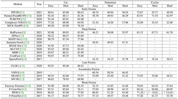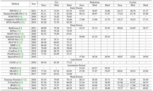 对于性能比较,我们主要关注KITTI基准中的两个主要任务,即3D检测和鸟瞰图目标检测。表2和表3分别在KITTI测试数据集的BEV和3D设置上呈现了最近多模态融合方法的实验结果。