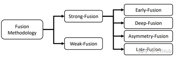 然而,最近的工作不能轻易地归类为这三类。因此,本文提出了一种新的分类法,将所有融合方法划分为强融合和弱融合,我们将在详细阐述。我们在图2中展示了它们之间的关系。