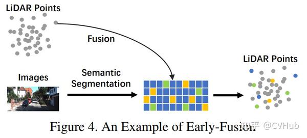 我们将强融合划分为四类,即早期融合、深度融合、后期融合和非对称融合,通过LiDAR和相机数据表示的不同组合阶段。作为最研究的融合方法,强融合在近年来取得了许多杰出成就。从图3中的概述可以很容易地发现,强融合中的每个次类高度依赖于LiDAR点云,而不是相机数据。接下来我们将进行具体讨论。