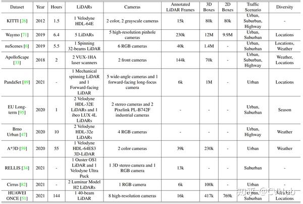 超过十个数据集与自动驾驶感知相关。然而,只有三个数据集常用,包括KITTI、Waymo和nuScenes。在这里,我们在表1中总结了这些数据集的详细特征。