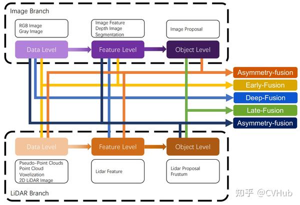 在本节中,我们将回顾LiDAR-相机数据融合的不同方法。从传统分类的角度来看,所有多模态数据融合方法都可以方便地分为三种范式,包括数据级融合(早期融合),特征级融合(深度融合)和对象级融合(后期融合)。