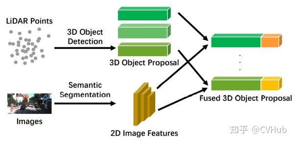 PI-RCNN将图像分支中的语义特征与原始LiDAR点云融合在一起,其在目标检测任务中获得了更好的性能。Complexer-yolo和SegVoxelNet也利用语义特征,但与上述方法不同,它将原始LiDAR点云预处理为体素化张量,以进一步利用更先进的LiDAR后端信息。Sensor Fusion将3D LiDAR点云转换为2D图像,并在图像分支中融合特征级表示,利用成熟的CNN技术实现更好的性能。Fast and Accurate 3D Object Detection将原始RGB像素与体素化张量融合在一起,而Kda3d[26]则将从图像分支生成的伪点云与LiDAR分支中的原始点云直接组合在一起,完成目标检测任务。
