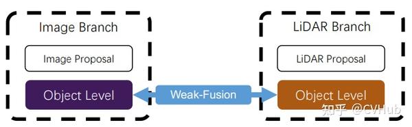 与强融合不同,弱融合方法不能直接从多模态分支中融合数据/特征/对象,而是以其他方式操作数据。基于弱融合的方法通常使用基于规则的方法来利用一种模态的数据作为监督信号来指导另一种模态的交互。图8展示了弱融合模式的基本框架。例如,图像分支中CNN的2D提议可能导致原始LiDAR点云中的出现锥体。然而,与上面提到的非对称融合结合图像特征不同,弱融合直接将这些选定的原始LiDAR点云输入到LiDAR主干中输出最终结果。