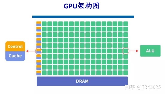 CPU遵循的是冯·诺依曼架构,其核心是存储程序/数据、串行顺序执行。因此CPU的架构中需要大量的空间去放置存储单 元(Cache)和控制单元(Control),相比之下计算单元(ALU)只占据了很小的一部分,所以CPU在进行大规模并行计 算方面受到限制,相对而言更擅长于处理逻辑控制。 GPU(GraphicsProcessing Unit),即图形处理器,是一种由大量运算单元组成的大规模并行计算架构,早先由CPU中分出 来专门用于处理图像并行计算数据,专为同时处理多重并行计算任务而设计。GPU中也包含基本的计算单元、控制单元 和存储单元,但GPU的架构与CPU有很大不同,其架构图如下所示。 与CPU相比,CPU芯片空间的不到20%是ALU,而GPU芯片空间的80%以上是ALU。即GPU拥有更多的ALU用于数据并行处 理。