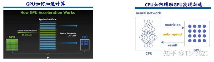 GPU 加速计算是指同时利用图形处理器 (GPU) 和 CPU,加快科学、分析、工程、消费和企业应用程序的运行速度。GPU 加速器于 2007 年由 NVIDIA率先推出,现已在世界各地为政府实验室、高校、公司以及中小型企业的高能效数据中心提供 支持。GPU 能够使从汽车、手机和平板电脑到无人机和机器人等平台的应用程序加速运行。 GPU 加速计算可以提供非凡的应用程序性能,能将应用程序计算密集部分的工作负载转移到 GPU,同时仍由 CPU 运行其 余程序代码。从用户的角度来看,应用程序的运行速度明显加快。 GPU当前只是单纯的并行矩阵的乘法和加法运算,对于神经网络模型的构建和数据流的传递还是在CPU上进行。CPU 与 GPU的交互流程:获取GPU信息,配置GPU id、加载神经元参数到GPU、GPU加速神经网络计算、接收GPU计算结果。