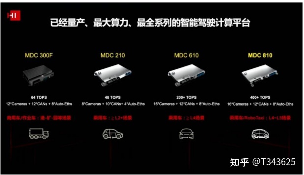 华为于2018年10月首次发布智能驾驶计算平台,支持L3的MDC600、支持L4的MDC300;2020年9月发布支持L2+的MDC210、支 持L3-L4的MDC610。MDC610正在洽谈搭载的车型有广汽埃安AION LX、长城沙龙机甲龙、广汽传祺。2021年4月发布支持L4-L5 的MDC810,首搭于北汽极狐阿尔法S华为HI版,正在洽谈搭载于2022年哪吒TA、广汽埃安;并计划2022年推出MDC100。