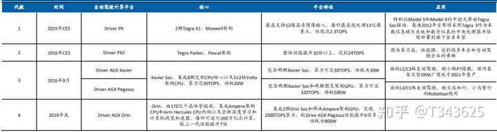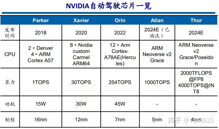 从2015年开始,英伟达开始进入车载 SoC和车载计算平台领域,为自动驾驶提供基础计算能力。 此后英伟达几乎每隔两年发布一款车规级SoC芯片,且不断拉升算力水平。2020年,Xavier芯片算力为30 TOPS,2022年发布的 Orin算力为254 TOPS,2022秋季GTC大会上发布了新自动驾驶芯片Thor,算力为2000TFLOPS@FP8、4000TOPS@INT8,取代了之 前发布的算力达1000TOPS的Altan。