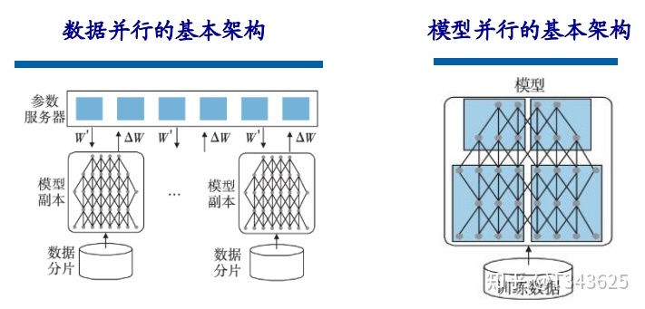 当训练的模型规模比较大时,可以通过数据并行的方法来加速模型的训练,数据并行可以对训练数据做切分,同时采用 多个模型实例对多个分块的数据同时进行训练。在数据并行的实现中,由于是采用同样的模型、不同的数据进行训练, 影响模型性能的瓶颈在于多 CPU 或多 GPU 间的参数交换。根据参数更新公式,需要将所有模型计算出的梯度提交到参数 服务器并更新到相应参数上,所以数据片的划分以及与参数服务器的带宽可能会成为限制数据并行效率的瓶颈。 除了数据并行,还可以采用模型并行的方式来加速模型的训练。模型并行是指将大的模型拆分成几个分片,由若干个训 练单元分别持有,各个训练单元相互协作共同完成大模型的训练。