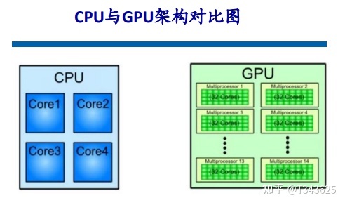 CPU 由专为顺序串行处理而优化的几个核心组成,而 GPU 则拥有一个由数以千计的更小、更高效的核心组成的大规模并 行计算架构,这些更小的核心专为同时处理多重任务而设计。 CPU和GPU之所以大不相同,是由于其设计目标的不同,它们分别针对了两种不同的应用场景。CPU需要很强的通用性来 处理各种不同的数据类型,同时又要逻辑判断又会引入大量的分支跳转和中断的处理。这些都使得CPU的内部结构异常复 杂。而GPU面对的则是类型高度统一的、相互无依赖的大规模数据和不需要被打断的纯净的计算环境。