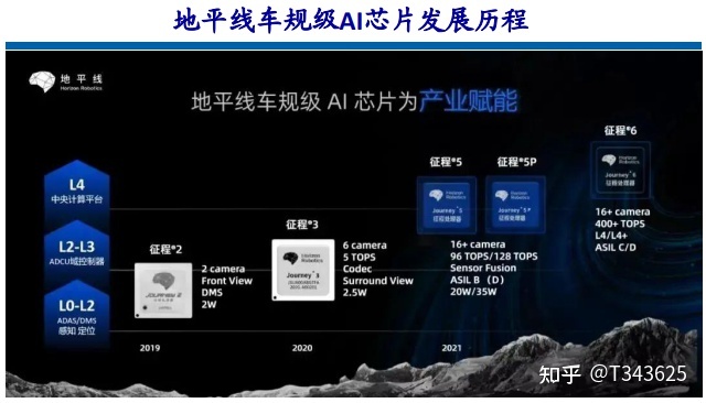 自2015年创立以来,地平线仅用了5年的时间即实现了车规AI芯片的量产落地,开启国产车规级AI芯片的前装量产元年。与此 相比,Mobileye的车规芯片从研发到正式商用历时8年;作为全球通用AI芯片龙头的英伟达,在CUDA发布后9年才将K1芯片应 用于奥迪A8的车用系统。 地平线首款芯片征程1发布于2017年12月;征程2发布于2019年8月,可提供超过4TOPS的等效算力;征程3算力为5TOPS,发布 于2020年9月;征程5发布于2021年7月,算力128TOPS。地平线的第三代车规级产品征程5兼具大算力和高性能,支持16路摄 像头感知计算,能够支持自动驾驶所需要的多传感器融合、预测和规划控制等需求。