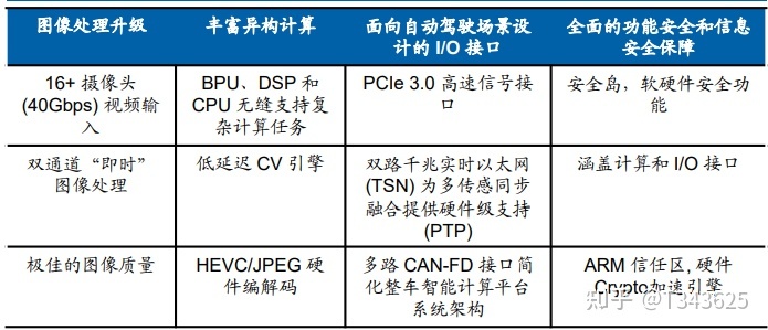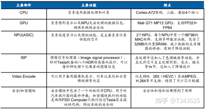 各类顶级芯片研发人员聚集,为特斯拉芯片自研奠定基础:2016 年 1 月,Tesla从 AMD 挖来传奇芯片架构师 Jim Keller,任命 他为 Autopilot 硬件工程副总裁。2016年2月,Tesla又从Apple招到了研发总监 Pete Bannon,Pete 是 A5 芯片核心的设计工程师, 在那之前他是 PA Semi 的架构与验证副总裁。同时期,同样来自 AMD 的谷俊丽,在Autopilot 硬件工程团队下开始组建机器学 习小组,这个小组有两个任务:一个是搭建第二代自动驾驶硬件上的 AI 算法和机器学习软件,另一个是参与设计 FSD 芯片的 架构和上面的软件。 采用以深度神经网络为主的人工智能模型,再加上车端收集的大量数据,特拉斯ADAS水平迅速提升:基于全新深度神经网络 的视觉处理工具TeslaVision是 Autopilot团队抛开 Mobileye、从零搭建的一套视觉处理工具,它的背后,是全新的底层软件技术 架构和云端大数据基础设施。Tesla Vision能够对行车环境进行专业的解构分析,相比传统视觉处理技术可靠性更高;借助 Tesla售出的车辆搜集的大量数据,反过来又可以对Tesla Vision的神经网络进行训练和改进,进一步优化Autopilot。 除车端芯片FSD的研发外,特斯拉也开始涉足云端训练芯片,试图打通车云系统。从算力来看,其1.09EFLOPS的算力水平和 Nvidia用4096块A100构建的集群(1.28 EFLOPS);Huawei用4096块Ascend 910构建的集群(1.05 EFLOPS);Google用3456块 TPU v4构建的集群(0.95 EFLOPS)相比,已经不相上下。其对称式的设计理念,可能给超算领域带来全新技术路线的可能性。 特斯拉的芯片自研的成功,竞争对手的可复制性很弱,主要原因有:(1)芯片顶级研发人才很难被车企所招聘,特斯拉有很 大程度是因为马斯克的个人魅力因素,才说服顶级芯片研发人员加入;(2)自研芯片风险极高,前期投入较大;(3)如果 不能保证使用的数量,则自研芯片性价比很低。因此,对于绝大多数车企来讲,外购芯片才是更好的解决方案。 FSD芯片 从算法需求倒推芯片架构,软硬件一体化实现高效算力。