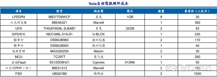 自动驾驶的硬件成本约占整体硬件成本的3.5%特斯拉自动驾驶硬件成本估算:特斯拉自动驾驶域的芯片成本约为5000元,加上外围电路板以及组装、测试成本(组装厂为 中国台湾广达集团),预估总体成本约为8000人民币,如果以特斯拉的毛利率计算,假设Model 3的成本为22.9万元,那么自 动驾驶域的成本占特斯拉整车成本约为3.5%。