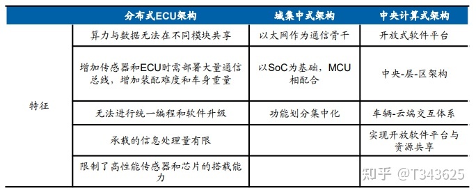 一体化 :云和边缘计算的数据中心,以及自动驾驶等超级终端领域,都是典型的复杂计算场景,这类场景的计算平台都是典型的大算 力芯片。大芯片的发展趋势已经越来越明显的从GPU、DSA的分离趋势走向DPU、超级终端的再融合,未来会进一步融合成超 异构计算宏系统芯片。 BOSCH给出了汽车电气架构演进示意图。从模块级的ECU到集中相关功能的域控制器,再到完全集中的车载计算机。每个阶段 还分了两个子阶段,例如完全集中的车载计算机还包括了本地计算和云端协同两种方式。