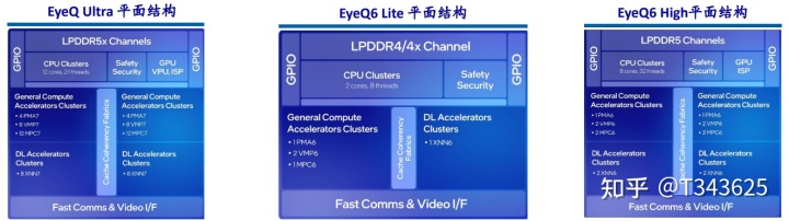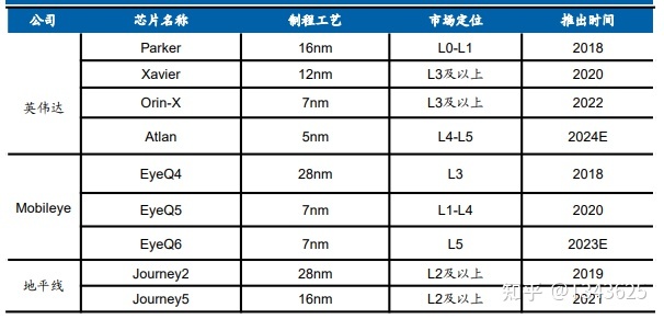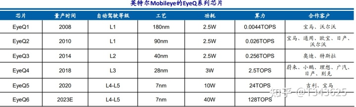 Mobileye在2022年推出了新型EyeQ Ultra,它专为自动驾驶而生。据 Mobileye称,EyeQ Ultra采用5nm工艺,将10个EyeQ5的处理 能力集成在一个封装中。但是其芯片的计算能力似乎略逊色于英伟达,EyeQ Ultra芯片具有170 TOPS,包括12个RISC内核、256 gigaflops、许多GPU和加速器内核等等,功耗不到100W,可以“处理 4 级(L4)自动驾驶的所有需求和应用”,而无需将多个 系统集成在一起的计算能力和成本,解决两个行业面临的重大挑战。EyeQ Ultra预计将在 2025 年全面投产。 Mobileye 还还推出了其最新一代芯片EyeQ6:EyeQ6L和EyeQ6H,采用7nm工艺,能用于ADAS L2,预计将于 2023 年年中开始生 产。该芯片已与大众和福特就地图技术达成扩展协议,以及与吉利达成新协议,到2024年推出全电动 L4 级自动化汽车。