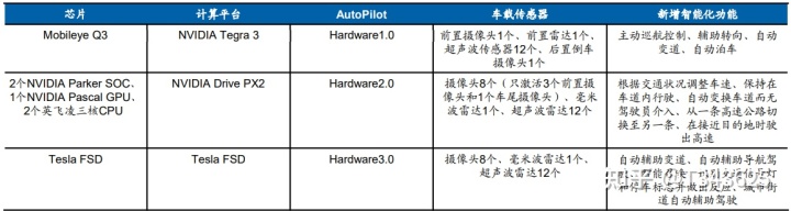 Tesla经历了外购主控芯片到自研的道路。2014年-2016年, Tesla配备的是基于Mobileye EyeQ3芯片的AutoPilot HW1.0计算平 台,车上包含1个前摄像头+1个毫米波雷达+12个超声波雷达。2016年-2019年, Tesla采用基于英伟达的DRIVE PX 2 AI计算平台 的AutoPilot HW2.0和后续的AutoPilot HW2.5,包含8个摄像头+1个毫米波雷达+12超声波雷达。 2017年开始Tesla开始启动自研主控芯片,尤其是主控芯片中的神经网络算法和AI处理单元全部自己完成。2019年4月, AutoPilot HW3.0平台搭载了Tesla FSD自研版本的主控芯片,这款自动驾驶主控芯片拥有高达60亿的晶体管,每秒可完成144万 亿次的计算,能同时处理每秒2300帧的图像。