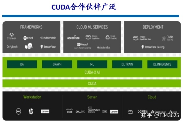 在软件层面,英伟达面向GPU开发的应用软件接口CUDA经久不衰,CUDA整套软件非常完善,与自家GPU自然适配,能快速搭 建神经网络加速软件框架,所以CUDA在早期被很多厂家用于神经网络加速,这也为其打造AI计算平台奠定了基础。另外一个 层面,除了CUDA,其他厂家的API也可以在英伟达的GPU上用于神经网络加速,应用程序也越来越多。 英伟达也通过多种方式鼓励高校和研究所从事CUDA相关研究工作,设立CUDA研发中心,发CUDA大师证书,做CUDA技术认 证,让学术界为CUDA背书,通过学术界为工业界做预研,通过学术界为工业界培养人才。