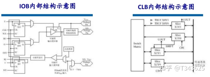 可编程输入/输出单元简称I/O单元,是芯片与外界电路的接口部分,完成不同电气特性下对输入/输出信号的驱动与匹配 要求。FPGA内的I/O按组分类,每组都能够独立地支持不同的I/O标准。通过软件的灵活配置,可适配不同的电气标准与 I/O物理特性,可以调整驱动电流的大小,可以改变上、下拉电阻。目前,I/O口的频率也越来越高,一些高端的FPGA通 过DDR寄存器技术可以支持高达2Gbps的数据速率。 CLB是FPGA内的基本逻辑单元。CLB的实际数量和特性会依器件的不同而不同,但是每个CLB都包含一个可配置开关矩阵, 此矩阵由4或6个输入、一些选型电路(多路复用器等)和触发器组成。开关矩阵是高度灵活的,可以对其进行配置以便 处理组合逻辑、移位寄存器或RAM。在Xilinx公司的FPGA器件中,CLB由多个(一般为4个或2个)相同的Slice和附加逻辑构 成。每个CLB模块不仅可以用于实现组合逻辑、时序逻辑,还可以配置为分布式RAM和分布式ROM。