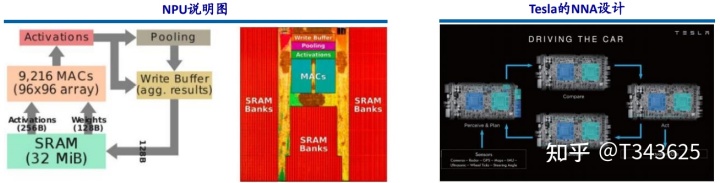 NPU具备强大运算能力。在每个计算周期,NPU都会从内置的32MB SRAM中读取256字节的激活数据和另外128字节的权重数 据组合在一起进入乘法累加(MAC),每个NPU都有一个96x96MAC阵列。在完成了MAC的乘法累加运算后,数据将会被转移 到激活(Activations)以及池化(Pooling)部分,并等待写入缓冲区汇总结果。 Tesla对于NNA的功耗和成本优化也做了不少的努力。 NNA 设计了非常大的片上SRAM缓存,相较于Google的TPU,采用了 256×256的MAC,只有24MB的SRAM。对于这种特殊的设计,Tesla解释这样做是为了让数据尽可能地在片内周转,而不用频 繁地与内存或者其他模块进行读写操作。这样做不但可以提高性能,还可以有效降低功耗。 Tesla在NNA的设计中还偏向于将硬件简化,并复杂化软件,这样做可以降低芯片成本。