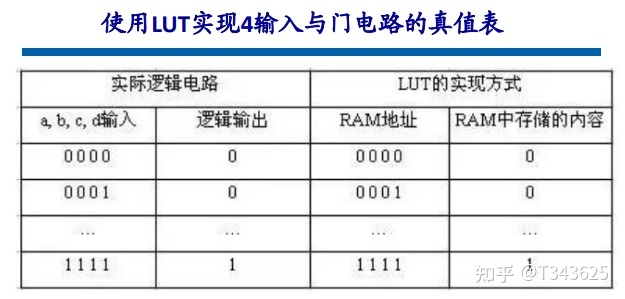 由于FPGA需要被反复烧写,它实现组合逻辑的基本结构不可能像ASIC那样通过固定的与非门来完成,而只能采用一种易 于反复配置的结构。查找表可以很好地满足这一要求,目前主流FPGA都采用了基于SRAM工艺的查找表结构,也有一些军 品和宇航级FPGA采用Flash或者熔丝与反熔丝工艺的查找表结构。通过烧写文件改变查找表内容的方法来实现对FPGA的重 复配置。 查找表(Look-Up-Table)简称为LUT,LUT本质上就是一个RAM。目前FPGA中多使用4输入的LUT,所以每一个LUT可以看成 一个有4位地址线的 的RAM。当用户通过原理图或HDL语言描述了一个逻辑电路以后,PLD/FPGA开发软件会自动计算逻辑 电路的所有可能结果,并把真值表(即结果)事先写入RAM,这样,每输入一个信号进行逻辑运算就等于输入一个地址 进行查表,找出地址对应的内容,然后输出即可。