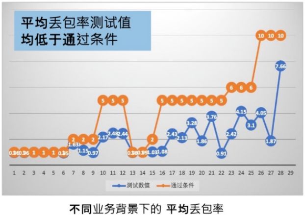 下图是测试的结果,对路侧设备进行测试,考虑了不同的测试距离、数据包长、业务背景下平均丢包率等指标,判断设备在不同测试距离、数据包长及背景业务用户数下,是否满足测试通过条件,若满足则认定通过测试。