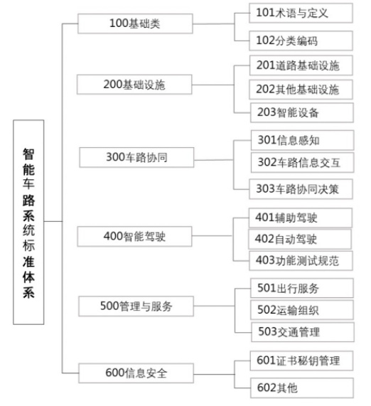 智能车路协同系统标准体系包括几大方面,其中100是基础类标准,200是基础设施类的标准,300是车路协同类的标准,而400是智能驾驶相关的标准,500是基于车路型企业、基于车路协同形成的智能交通管理和服务的标准,600是信息安全的标准,这些标准支撑着相关的智能车路产品和系统。