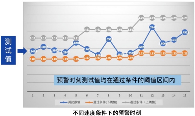 在实际的一个测试例子中,测试速度分别选取20km/h、40km/h和60km/h,测试结果中的预警时刻、预警距离指标测试值均在通过条件范围内,通过测试。