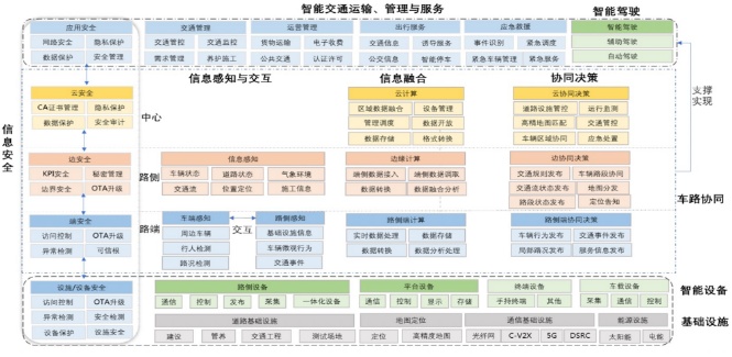 在智能交通部分,关于车联网(智能交通相关)子标准体系技术结构的研究参考了国内外典型技术架构与国内示范路与测试基地建设经验,从而构建智能车路协同系统的标准体系。