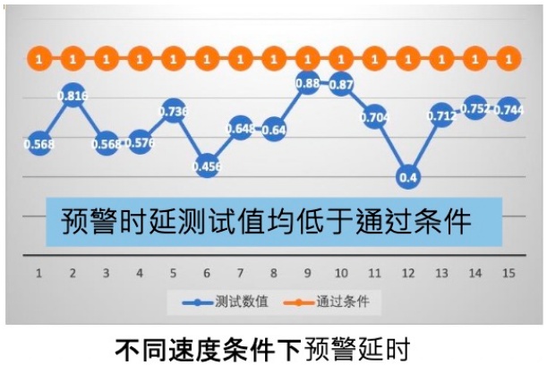 关于开展的测试工作,分别选取了不同的速度,测试不同速度预警的时延情况,发现不同速度预警延时最大为0.87,均小于1,测试5次均满足通过条件。