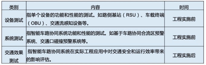 测试类别主要分为三类,第一类是设备测试,主要指单个设备的功能和性能测试,如路侧基站、车载终端及交通流感知设备,目的是在工程实施前确保设备达标。第二个是系统测试,由单个设备组成智能车路协同系统功能和性能的测试,需要在工程实施前确保每个构成系统的功能正常。第三个是交通效果测试,主要指智能车路协同系统在实际工程应用中对于交通安全和运行效率的具体影响进行评估。