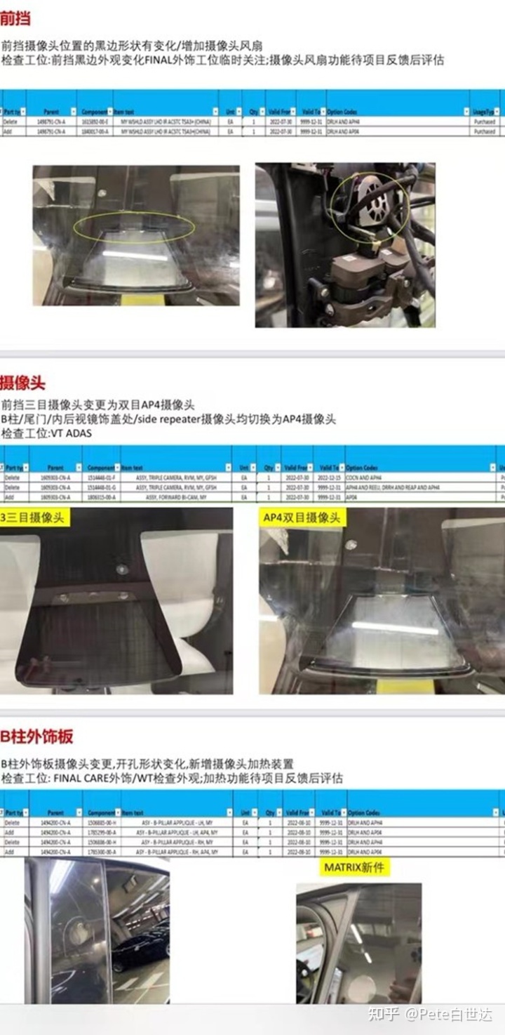 根据特斯拉中国的相关工艺文件,主要的变化是前挡的三目摄像头变为双目,并增加摄像头风扇,同时把其他摄像头均切换为AP4摄像头。